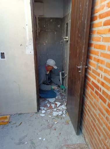 c. Bagno 60%: parete in mattoni comuni con tubature dell'acqua in PVC rigido e rubinetti per l'acqua fredda.