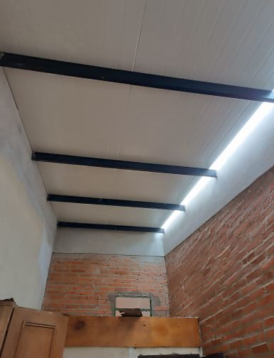 b. Tetto termoacustico: sostituzione delle vecchie tegole con lastre di polistirolo termoacustico da 3 cm di spessore e lamiera color ceramica.