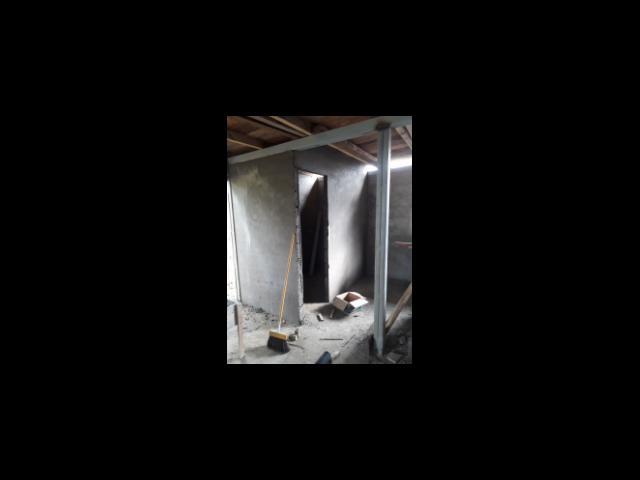 Dalla fine di agosto alla metà di novembre di quest'anno, abbiamo proceduto con i lavori di costruzione: scavo e miglioramento dei terreni per garantire le fondamenta, l'assemblaggio delle colonne e delle travi in ​​acciaio G 0, 2 posizionamento muratura, armatura in acciaio strutturale con fogli preverniciati come copertura, impianto elettrico, acqua e canalizzazione di rifiuti solidi e liquidi diretti ai serbatoi settici che erano stati precedentemente scavate per ciascuna famiglia beneficiaria.