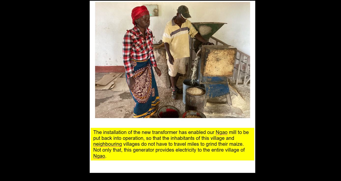 Nella descrizione della foto di copertina: L’installazione del nuovo generatore ha permesso al mulino del nostro villaggio di Ngao di funzionare. Gli abitanti del villaggio e dei villaggi limitorfi non devono più percorrere molte miglia per macinare il loro mais.