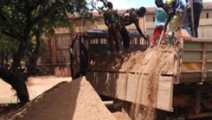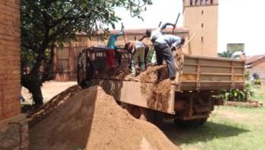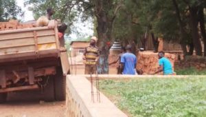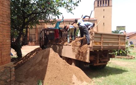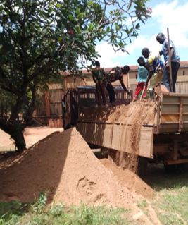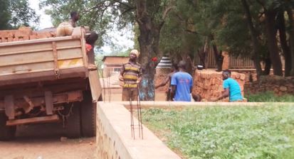 Si è proceduto a far arrivare soprattutto il cemento da Bangui, perchè a Bambari non si trova. E poi sabbia, … i mattoni trovati non lontano dal cantiere.