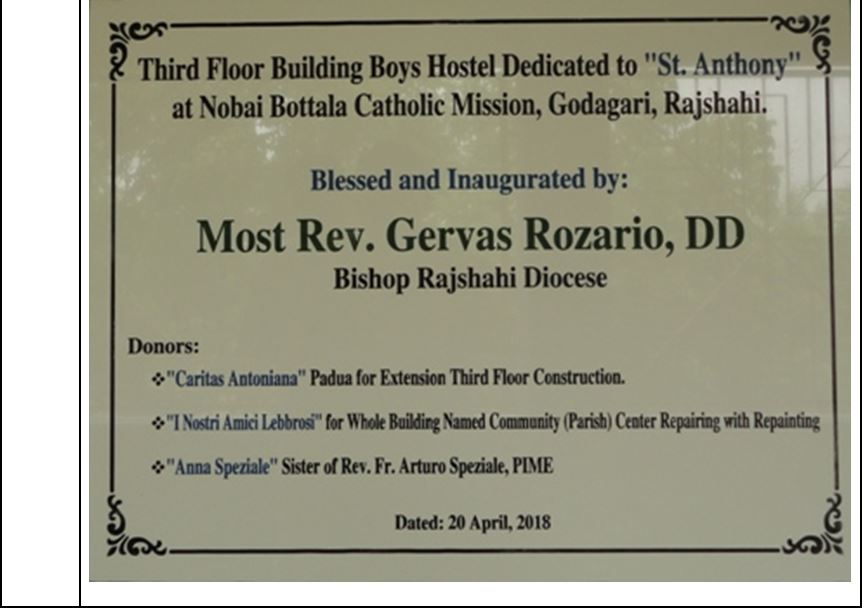 In allegato mando anche le foto del III Piano, terminato. Le foto per il resto dell’edificio, che è stato imbiancato all’esterno e all’interno e che i servizi igienici del I e II Piano sono stati sistemati, piastrellati dove c’era bisogno. I lavori termineranno il 14 o il 15 di Marzo con l’istallazione di 7 ventilatori (perché qui in Bd. i ventilatori sono una necessità, almeno nelle Istituzioni che si rispettino. Contatterò il nostro vescovo most Rev. Gervas Rozario, quando potrà venire a benedire i locali e la struttura, anche se sono già usati per bisogni logistici.