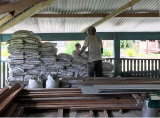 La merce e’ arrivata, e’ stata scaricata e deposta in magazzino ma ancora non e’ sul posto per mancanza dei giovani che si trovano ora in vacanza semestrale (un mese) fino alla prossima settimana 22 Luglio. Gli operai, vista la mancanza di materiale, si sono fatti tre mesi di vacanza causa anche la pioggia che in questi mesi e’ super abbondante.