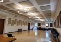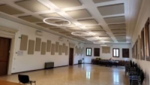per quanto riguarda l’illuminazione del salone siamo ancora nella stessa situazione: come detto il materiale è già stato consegnato e pagato da tempo ma non è ancora stato possibile montarlo perché devono essere piazzati prima i pannelli dell’insonorizzazione. L’installazione dei pannelli è in corso d’opera da una settimana tramite il nostro manutentore interno, ci vorrà un po’ perchè è un lavoro non proprio semplicissimo e perchè il manutentore deve anche occuparsi di altre urgenze nel frattempo, ma appena avrà terminato quello potremo finalmente procedere al piazzamento dei lampadari e dei collegamenti elettrici.