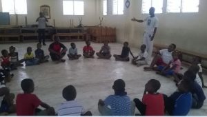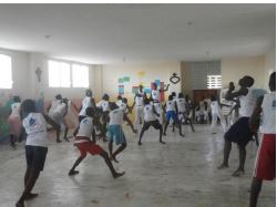 Vi allego le foto che un volontario italiano, arrivato da una settimana, ha scattato oggi…appassionandosi già a capoeira. La grande sala è il refettorio della  nostra scuola elementare, ricostruito dopo il terremoto.