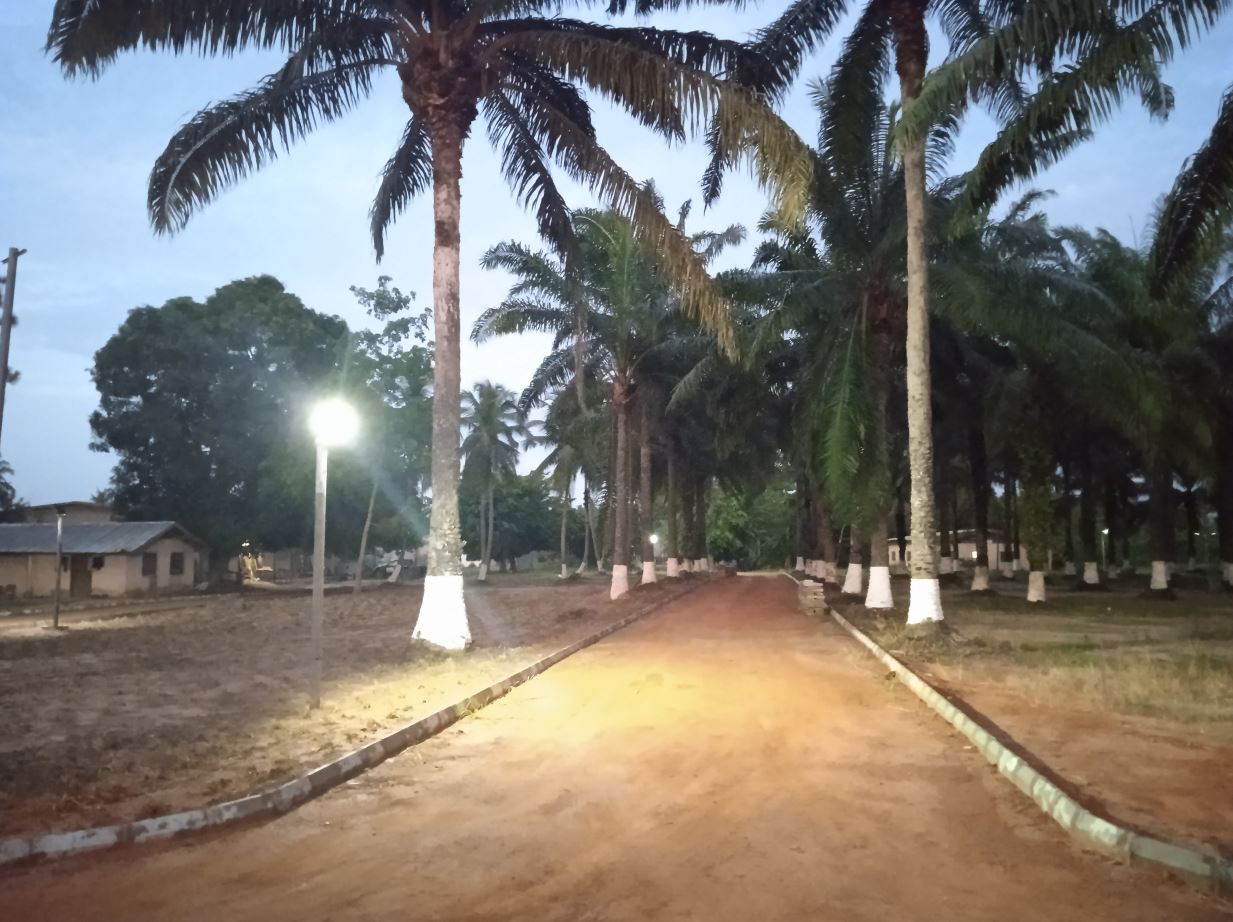 Tutte le altre strade saranno dotate di cordoli in cemento con la funzione di contenimento della miscela laterite/cemento. E’ da segnalare che qui in Costa d’Avorio tutte  le strade asfaltate sono costruite con questa tecnica per la realizzazione del fondo, con la sola aggiunta di asfalto. Poiché è stato necessario procedere alla pulizia da erbe infestanti di un’area vasta di circa 10.000 mq,  per poter realizzare al meglio i percorsi delle strade, abbiamo iniziato da subito a piantumare 6.000 mq di una graminacea tappezzante che permetterà di facilitare le operazioni di manutenzione ordinaria di tutto il complesso impedendo la crescita di erbacce infestanti.