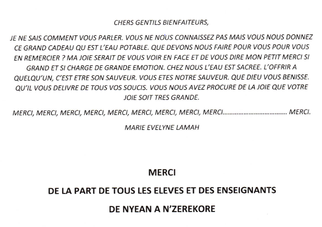 Je voudrais de tout cœur vous remercier pour avoir accepté de financer notre projet de forage pour l école de Nyean à n Zerekore en Guinee.