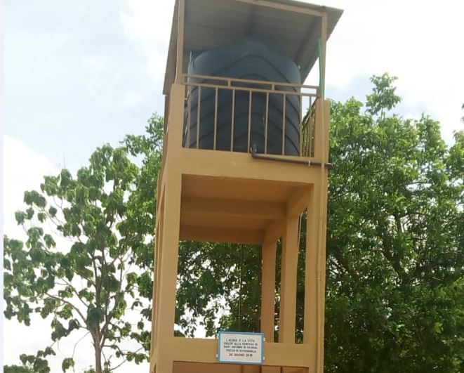 La realizzazione prevede pertanto lo scavo di un pozzo di 40 mt. con l’installazione di una pompa a motore (con pannelli solari) e la costruzione di una cisterna a castello di 800 lt.